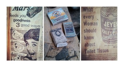 A 1950’s newspaper, paint tins, cigarette packets and half-century old glass milk bottles, with milk in them!