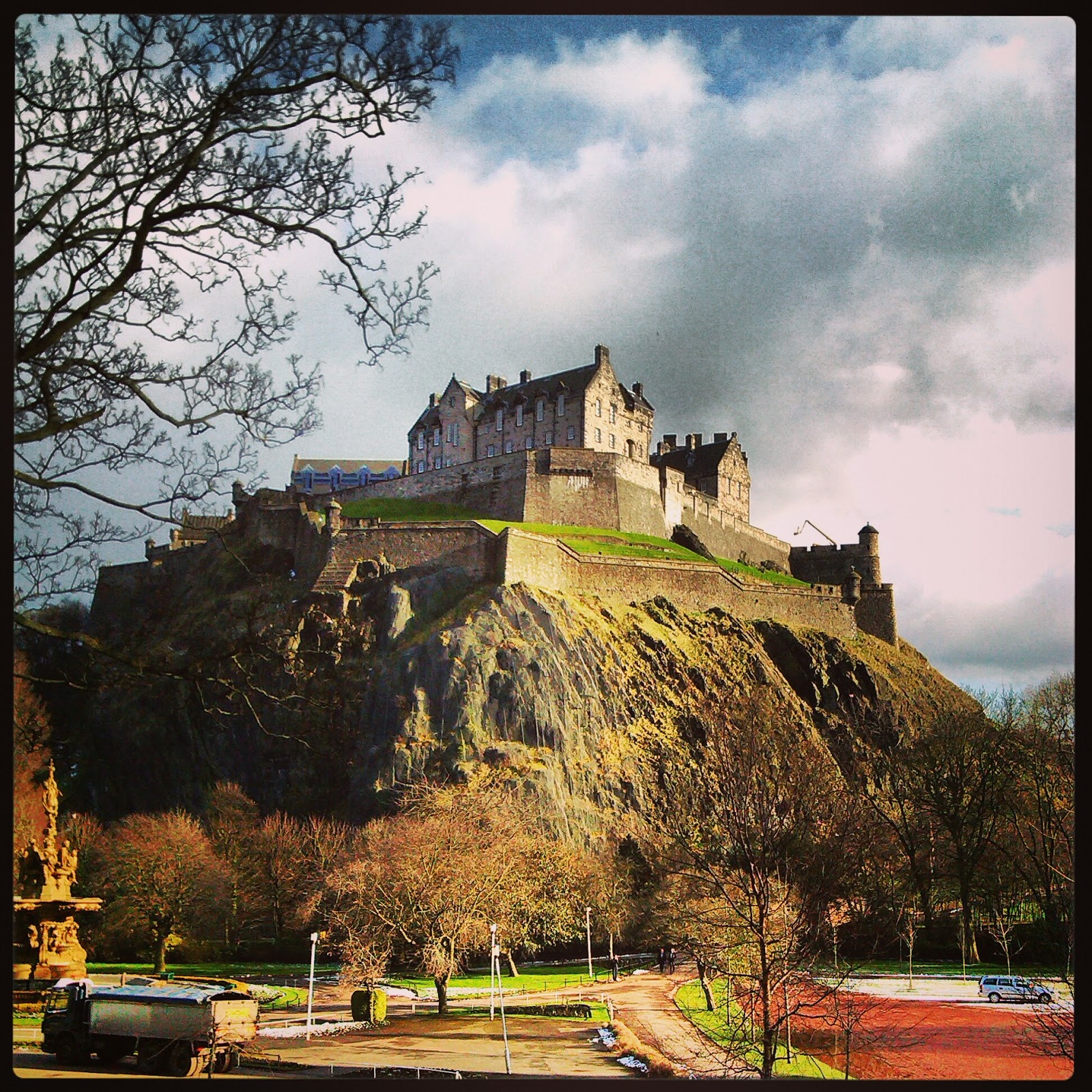 It is cold but with no breeze and suitable clothing it is perfect. The sky in Scotland has a unique quality, it seems that way to me at least. The blues seem more purple and the clouds more contrasting, with dark and light patches that give them an ‘edited’ look. It has been snowing for days, the snow melted as I spent another day in town, I have these days in town each weekend. It takes an hour on a bus for me to get to the centre of Edinburgh, I love it there. My parents left here when they were younger than I am now, they both walked these same streets.