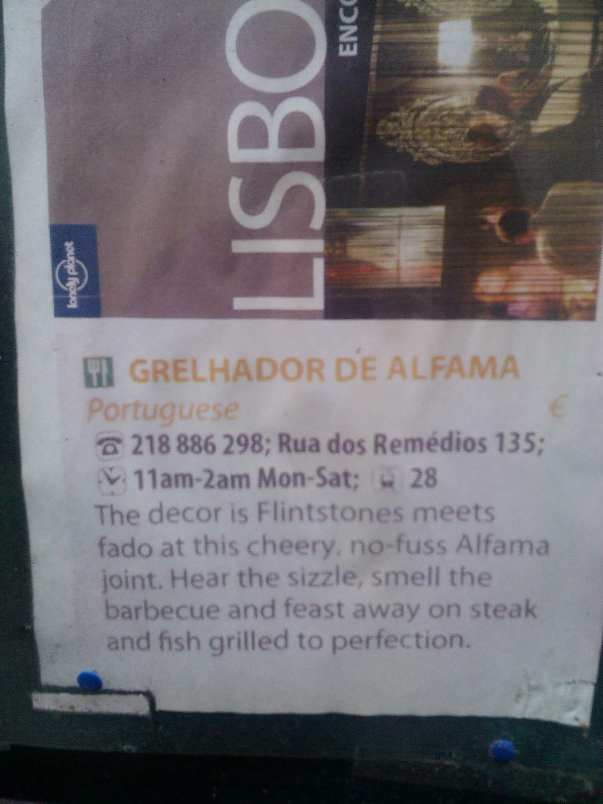 The restaurant was promising at first. Marshall, Nadine and myself found Grelhador De Alfama after we had lost track of our friends (including my girlfriend Jess) at the nearby flea market. A woman in the front coaxed us in. She pointed at a lonely planet recommendation hanging on the wall in a clear-file folder on the front of the building, with that we went in.