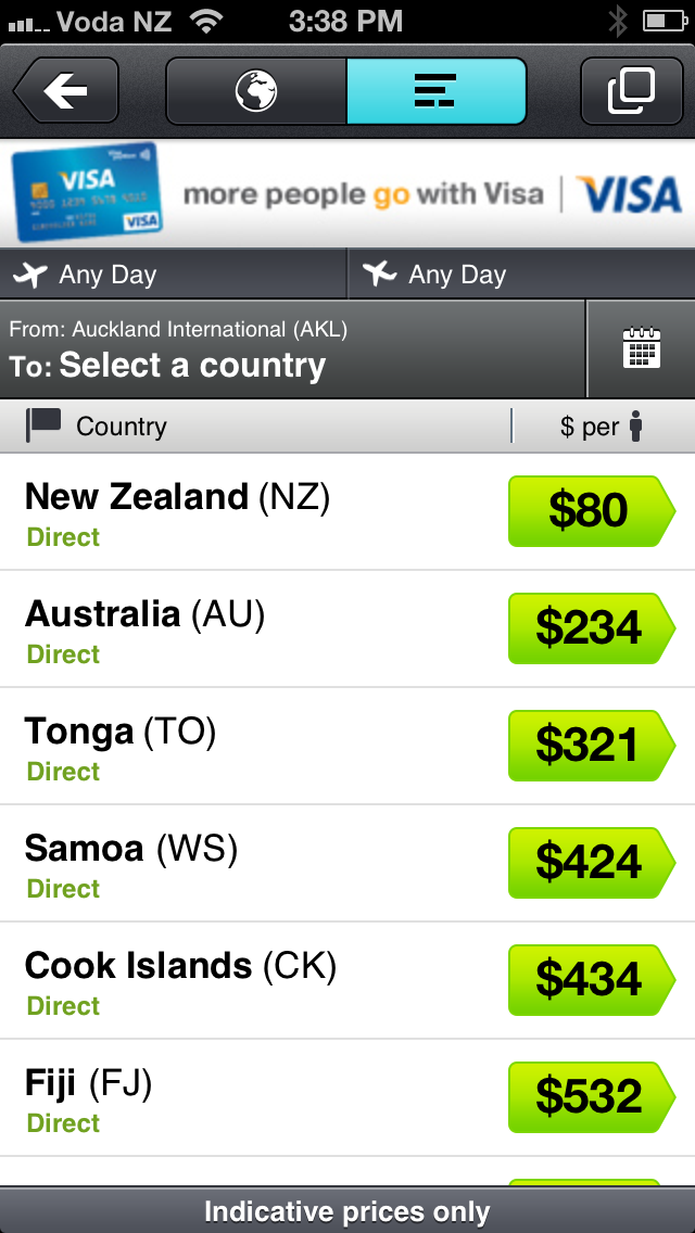 Doing the same here; From Auckland, to “Everywhere” yields the following results: