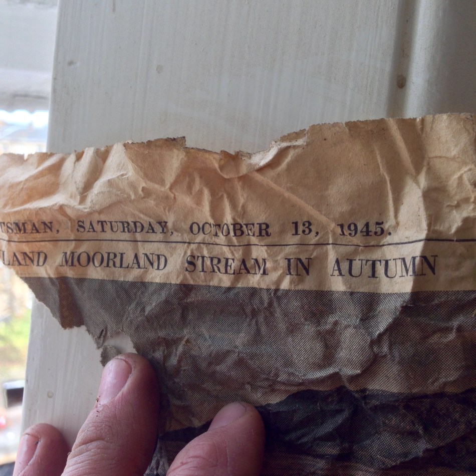 The wall I demolished was up on the top floor, the newspaper is dated October 13th, 1945. two months after world war 2. I know Edinburgh got bombed, sometimes 240 planes at a time. Maybe the building we are working on was one of the reconstruction projects? It’s only 2 months after the war ended! Not too far-fetched?
